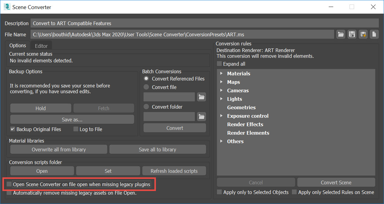Any changes will be saved to a duplicate in the following directory: The scene converter easily converts your legacy scenes to take advantage of newer lights, materials, and renderer features.. The first time you use the scene converter, it will open with a conversion preset file called art.